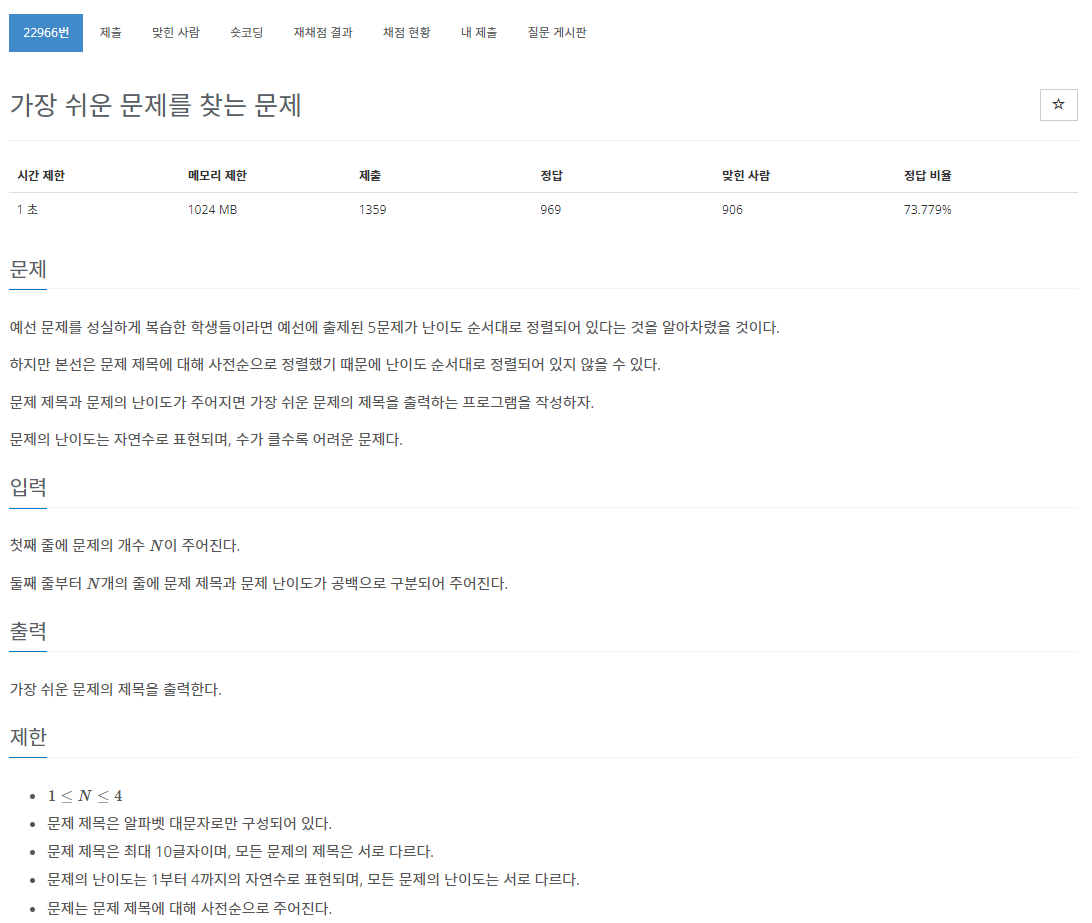 딕셔너리를 쓸지 고민했는데 for 문으로 될거같아서 두개의 리스트를 만들어서 난이도 부분인 difficulty 리스트에서 최솟값을 찾아 그에 해당하는 순서의 제목을 출력하도록 해봤다.