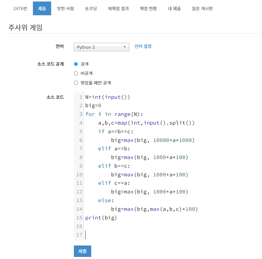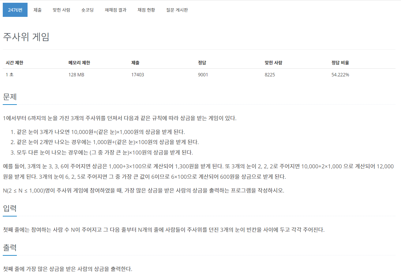 오늘은 백준 2476번, 22966번 문제풀이를 진행해본다.