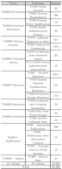- 라벨링: TrailDiscover 데이터셋을 활용하여 수집된 AWS CloudTrail 로그(특히 eventName )를 MITRE ATT&CK 전술 및 기법과 매핑하여 라벨링을 진행했다. 학습에 사용된 주요 공격 기법과 데이터 분포는 Table 2에 정리되어 있다.