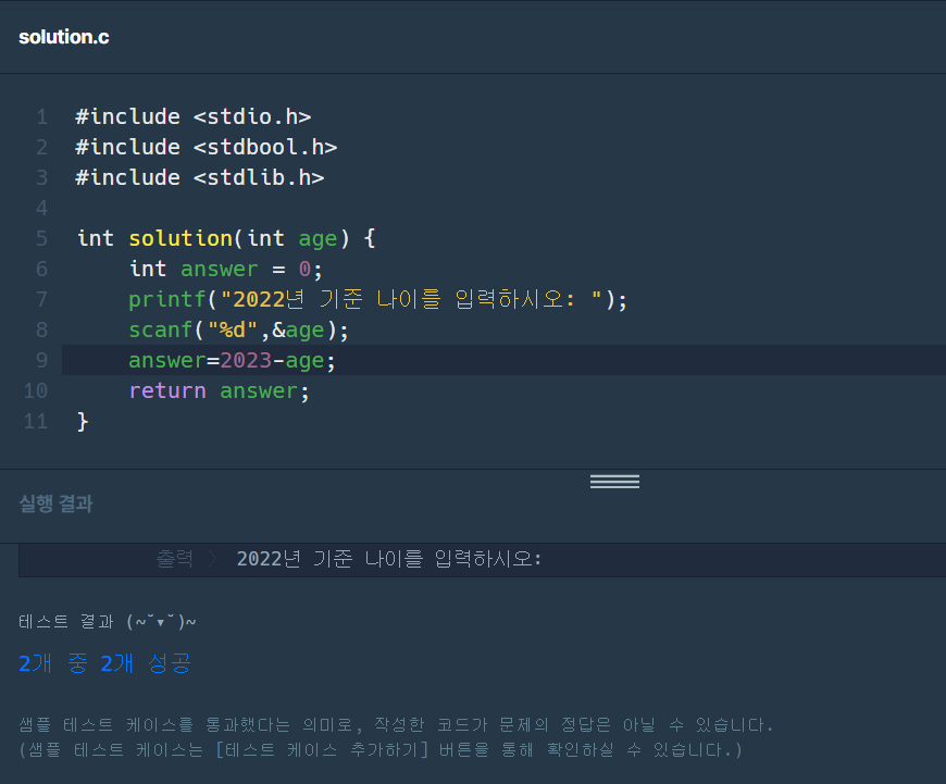 나이를 scanf로 입력받아 age에 저장한다. 나이는 태어난 연도에 1살이며 1년마다 1씩 증가하므로2022년보다 1 많은 2023-age를 answer에 저장한다.