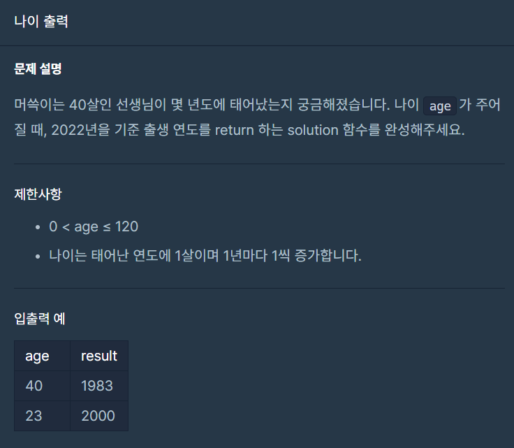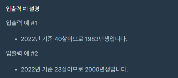 [3주차] 알고리즘 Programmers 문제풀이 문제 1_나이 출력 본문