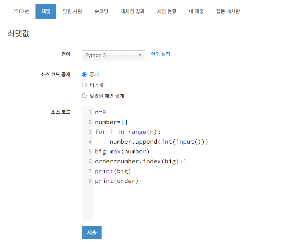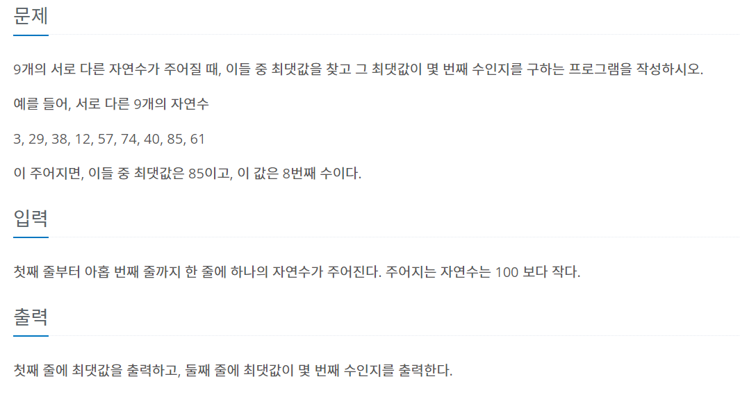 이제 두번째 알고리즘 풀이인 2562번 문제(최댓값)도 풀어보자.