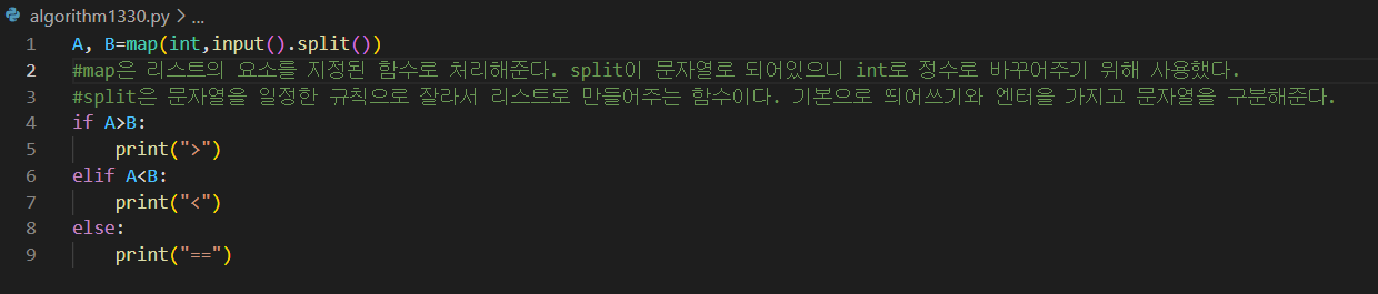 파이썬 함수인 map 과 split을 활용하였다. 각 함수에 대한 설명은 주석으로 달아놓았다.