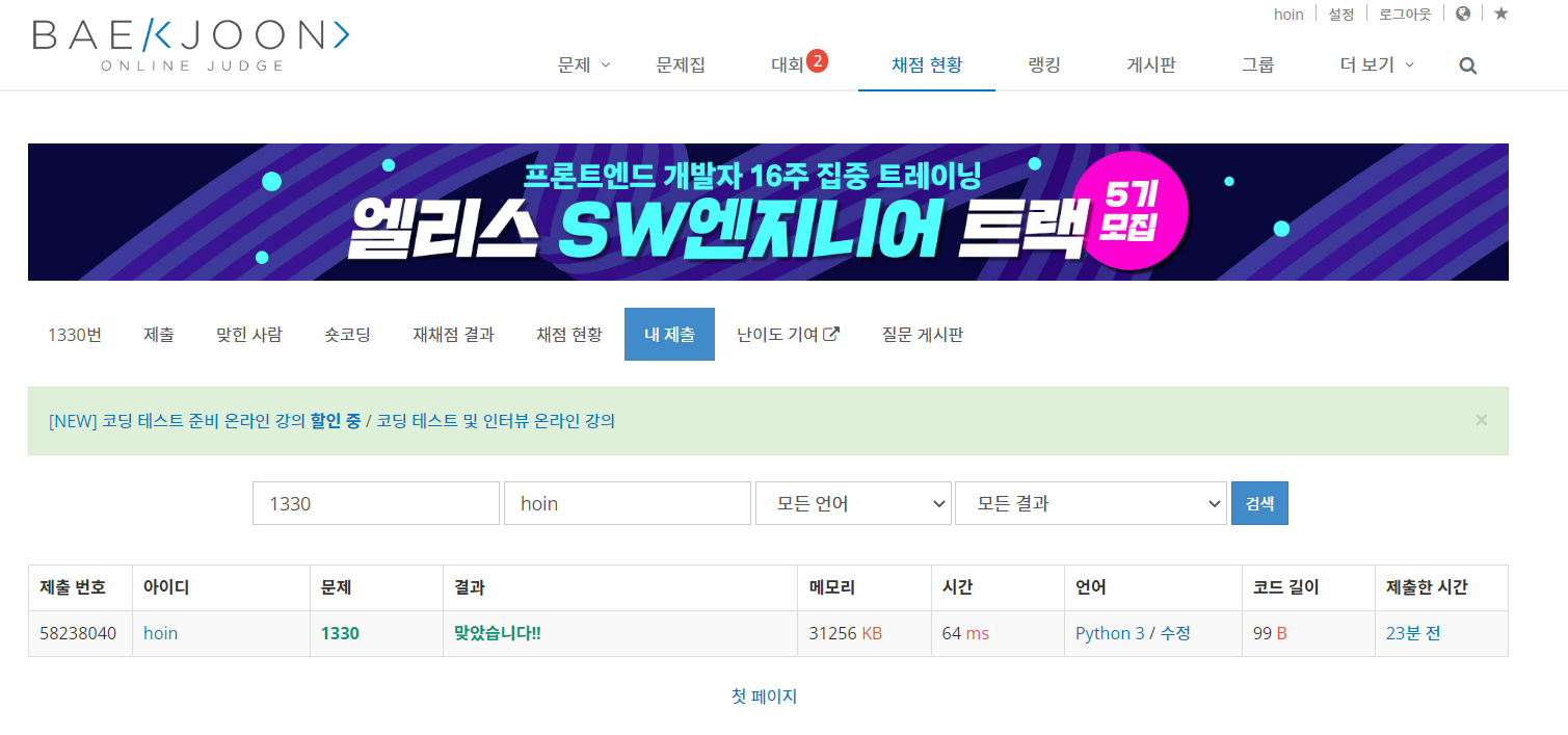 파이썬으로 언어를 선택하고 코드를 넣어 제출한다.