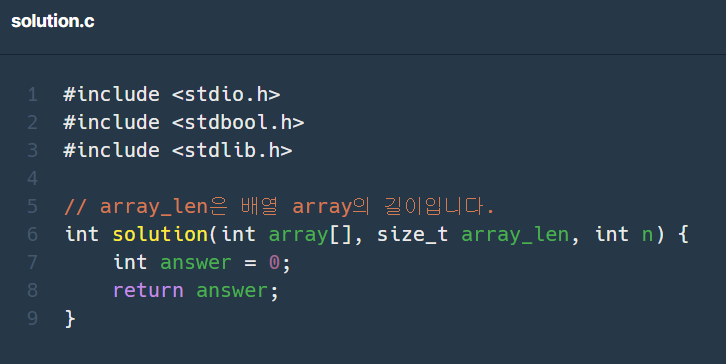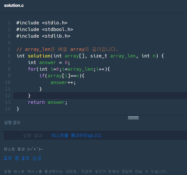 for문을 사용해서 배열 array의 각 자리를 1씩 더해주면서 n과 일치하면 answer에 1씩 증가시키게끔 하였다.