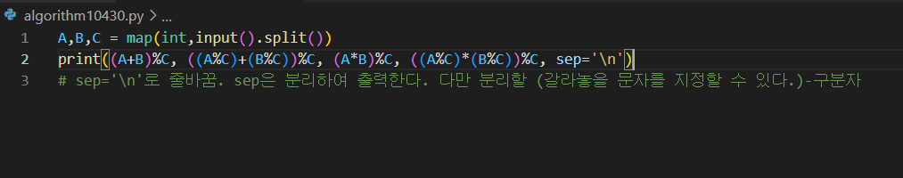 split()은 입력값을 쪼개서 분리해준다. 띄어쓰기로 값을 분리하여 입력하면 각 변수값으로 지정된다. sep에 대한 설명은 주석을 참고할 것.