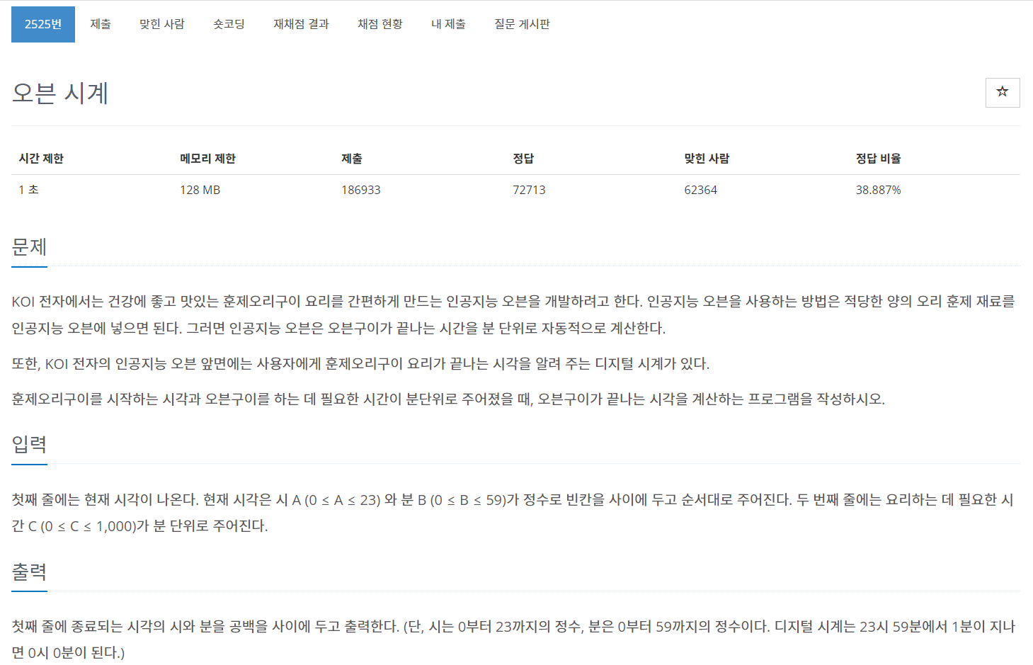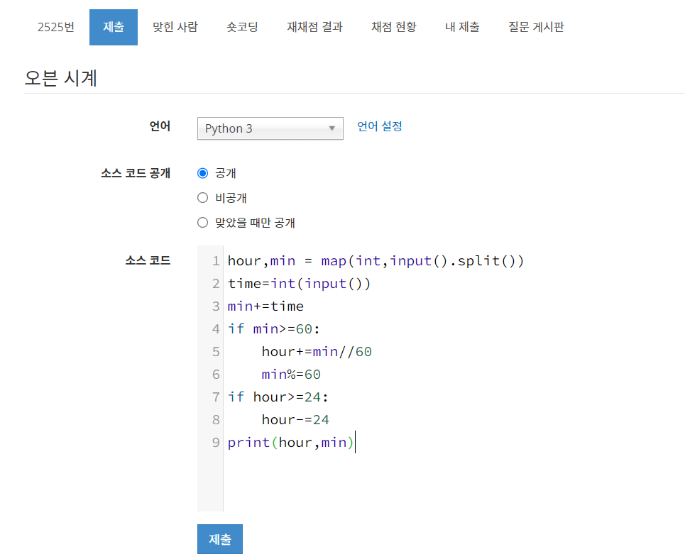 시간, 분 변수를 hour, min으로 지정해주고 오븐구이 소요시간을 time으로 지정해주었다. 각 값을 입력받아 time을 min에 더해주고 min의 값이 60이상이 되면 60으로 나눈 몫을 hour에 더해주고 min에는 60으로 나눈 나머지를 넣어주었다. hour의 값이 24 이상이 되면 hour에 24를 빼주는 조건문을 작성했다.