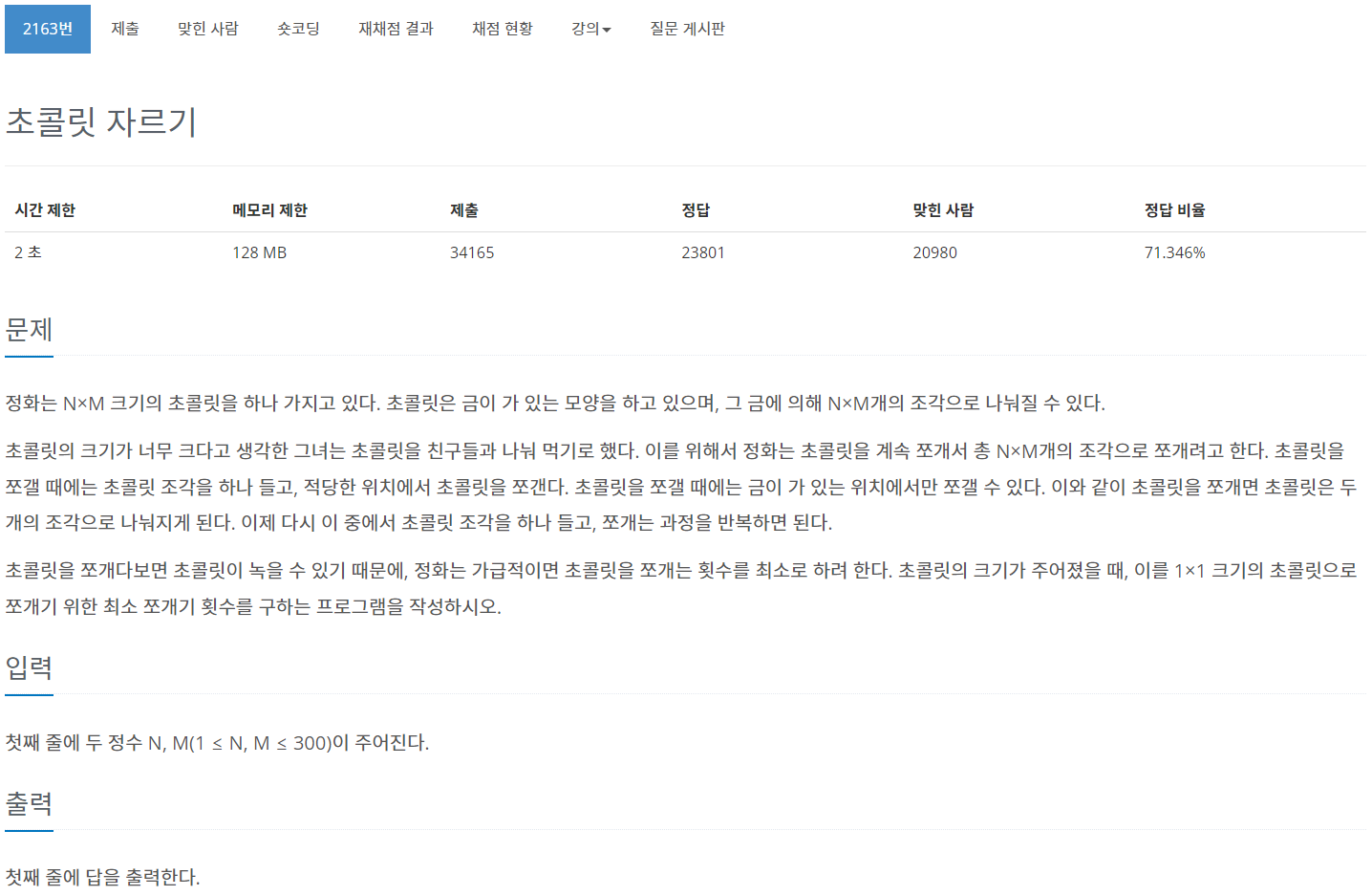 오늘은 백준 2163 문제로 시작한다.