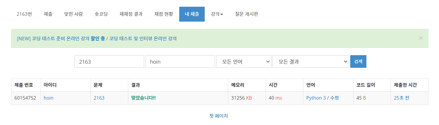 예제값이 잘 출력되니 제출한다.