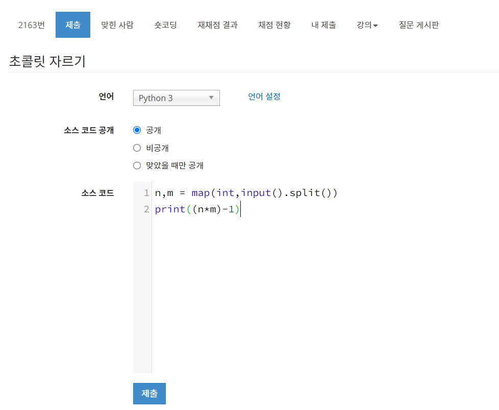 오늘도 어김없이 파이썬으로 작성해본다. N과 M값을 n,m변수로 입력받아주고 쪼개지는 조각에서 1을 뺀 값을 출력해주면 된다.